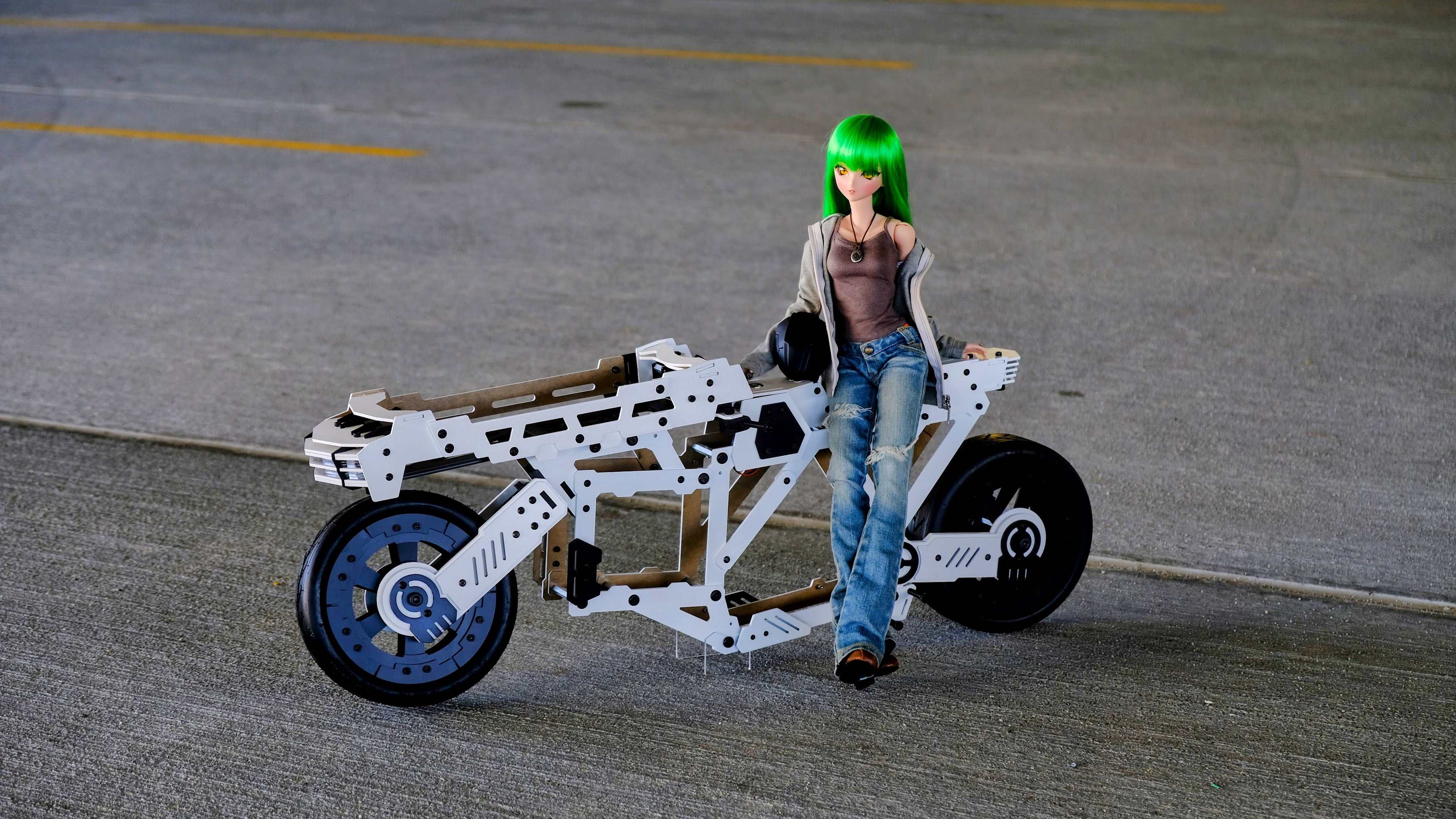 The bike is made from 3mm matte laser cut acrylic, While made in the US parts are sourced globally to maintain high standards and quality.  The Quantum Retrograde Bike is currently available in two color options, Carbon Black and Glacier White.